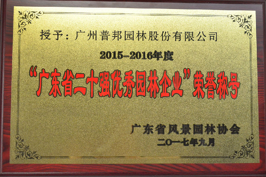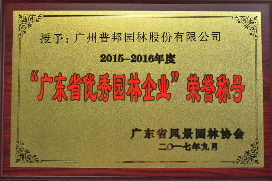 自2008年始,我司连续9年斩获“广东省优秀园林企业”奖项,是我司具备良好市场口碑与形象的证明。作为广东省风景园林协会副会长单位,我司将继续积极推动全省园林行业持续、健康发展,为“加快生态文明建设,建设美丽中国”做出新的贡献。