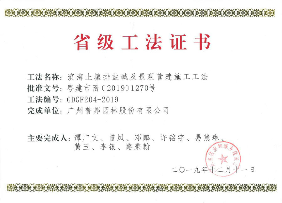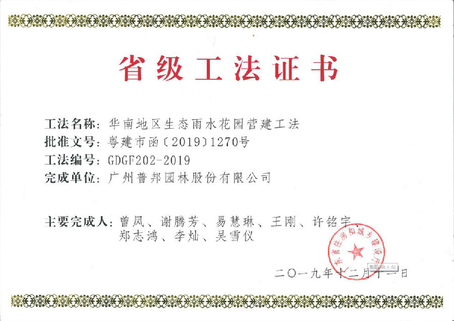 近日,我司收到广东省住房和城乡建设厅颁发的《华南地区生态雨水花园营建工法》(GDGF202-2019)、《华南地区轻型屋顶绿化营建工法》(GDGF203-2019)、《滨海土壤排盐碱及景观营建施工工法》(GDGF204-2019),这是我司在海绵型绿地建设技术和滨海景观生态修复实践取得的重要成果。