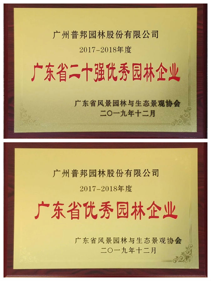 近日,广东省风景园林与生态景观协会经严格评估审定,公布了“2017-2018年度广东省优秀园林企业”、“2019年度广东省风景园林与生态景观优良样板工程”等奖项的获奖名单。我司荣获“2017-2018年度广东省二十强优秀园林企业”、“2017-2018年度广东省优秀园林企业”2项企业荣誉称号及5项“2019年度广东省风景园林与生态景观优良样板工程金奖”,同时,我司戚甫友、吴剑、刘斌、曾凤四位获得广东省园林绿化工程优秀项目负责人称号,此次我司获奖数量及质量位居园林企业之首。