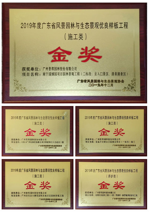 据悉,自2008年起,我司已经连续11年获得此两项称号,这不仅充分肯定了我司在行业中的领先地位与良好的品牌口碑,也体现出我司采用先进规范的管理机制实现了企业持续健康发展。多年来,我司始终秉承着“质量第一、诚信为先”的做事宗旨,坚持以精品铸就品牌,以品牌赢得市场的理念。此次申报的5个工程项目,全部荣获“2019年度广东省风景园林与生态景观优良样板工程金奖”,包括4项施工奖和1项养护奖。分别是工程奖:①《南宁园博园项目园林景观工程(二标段:主入口景区、清泉湖景区)》、②《GH4.0广州长隆熊猫酒店项目园建绿化生态建设工程》、③《宜昌市求雨台公园建设项目(一标段)》、④《广州佳兆业天穗花园项目展示区园林景观工程》;养护奖《前海片区景观工程(一期)及前湾一路景观廊道景观工程》。此奖项为广东省风景园林与生态景观领域最具影响力的省级荣誉奖励之一。