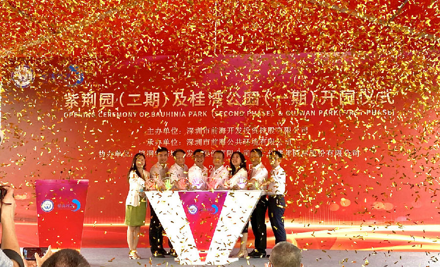 8月27日下午,紫荆园(二期)及桂湾公园(一期)开园仪式在我司承建的桂湾公园I标D区举行。前海管理局副局长谢晖晖、刘昌松,前海控股董事长刘胤华,前海控股总经理郭军、前海管理局相关处室代表以及两大公园参建单位代表共同出席见证。我司董事兼规划设计事业部总裁叶劲枫先生、生态环境事业部工程总裁朱健超先生、生态环境事业部工程管理部项目总监吴剑先生受邀出席,共同见证这一光荣时刻。