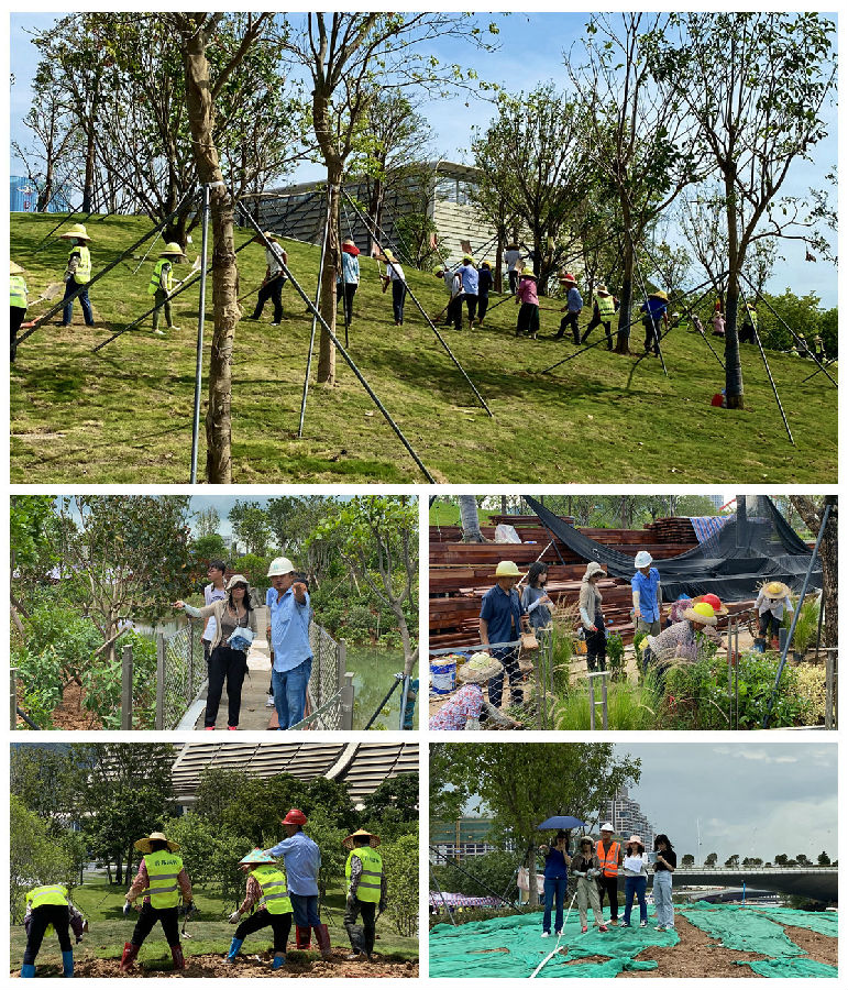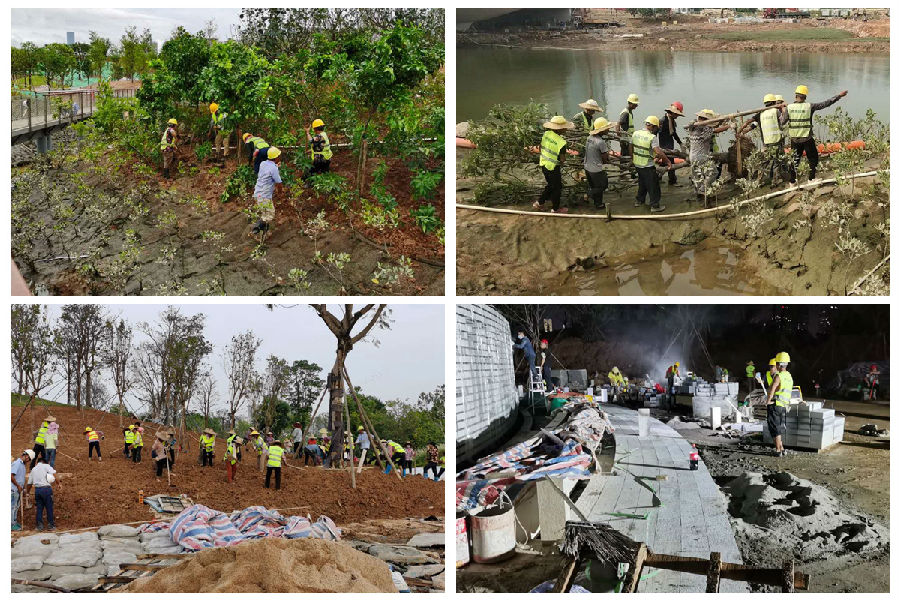 在赶工关键时期,我司生态环境事业部工程总裁朱健超先生连续数日冒雨在一线指挥,并从周边项目协调大量资源驰援前海。我司董事兼规划设计事业部总裁叶劲枫院长、我司董事兼总工程师全小燕女士带领优秀设计师,日夜在现场配合设计单位指导现场施工。在领导的带领下,整个前海项目部上下同心,众志成城连续奋战数周,将原本贫瘠的滩涂打造成了“前海绿芯”。