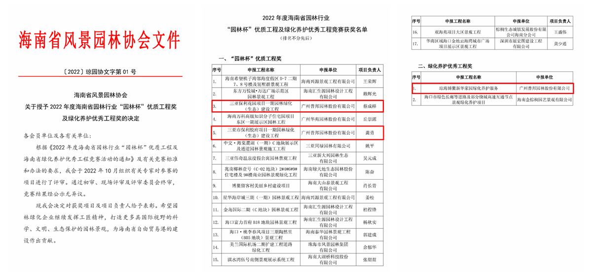 近日,由海南省风景园林协会主办的2022年度海南省园林行业“园林杯”优质工程及绿化养护优秀工程竞赛活动落下帷幕,普邦股份送审参评的“三亚保利花园项目一期园林绿化(生态)建设工程”、“三亚市保利悦府项目一期园林绿化(生态)建设工程”荣获“园林杯”优质工程奖,“琼海博鳌新华家园绿化养护服务”荣获“绿化养护优秀工程奖”。